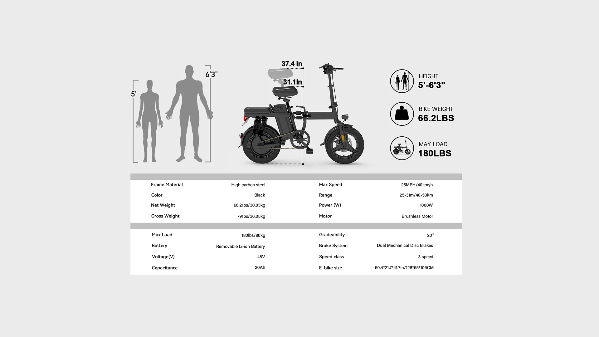 Equipped with a powerful 48V lithium-ion battery and a 20Ah capacity, the Z1 electric bike offers an impressive range of up to 31 miles on a single charge. Recharge time is just 6–8 hours, so you’ll be ready to ride again in no time. Overall dimensions: 81×45×67 cm | Net weight: 30.05 kg (66.2 lbs).
